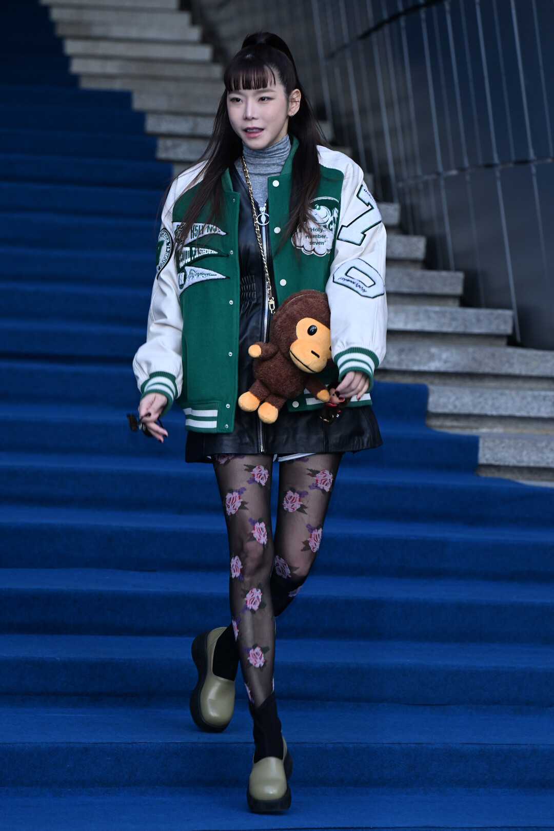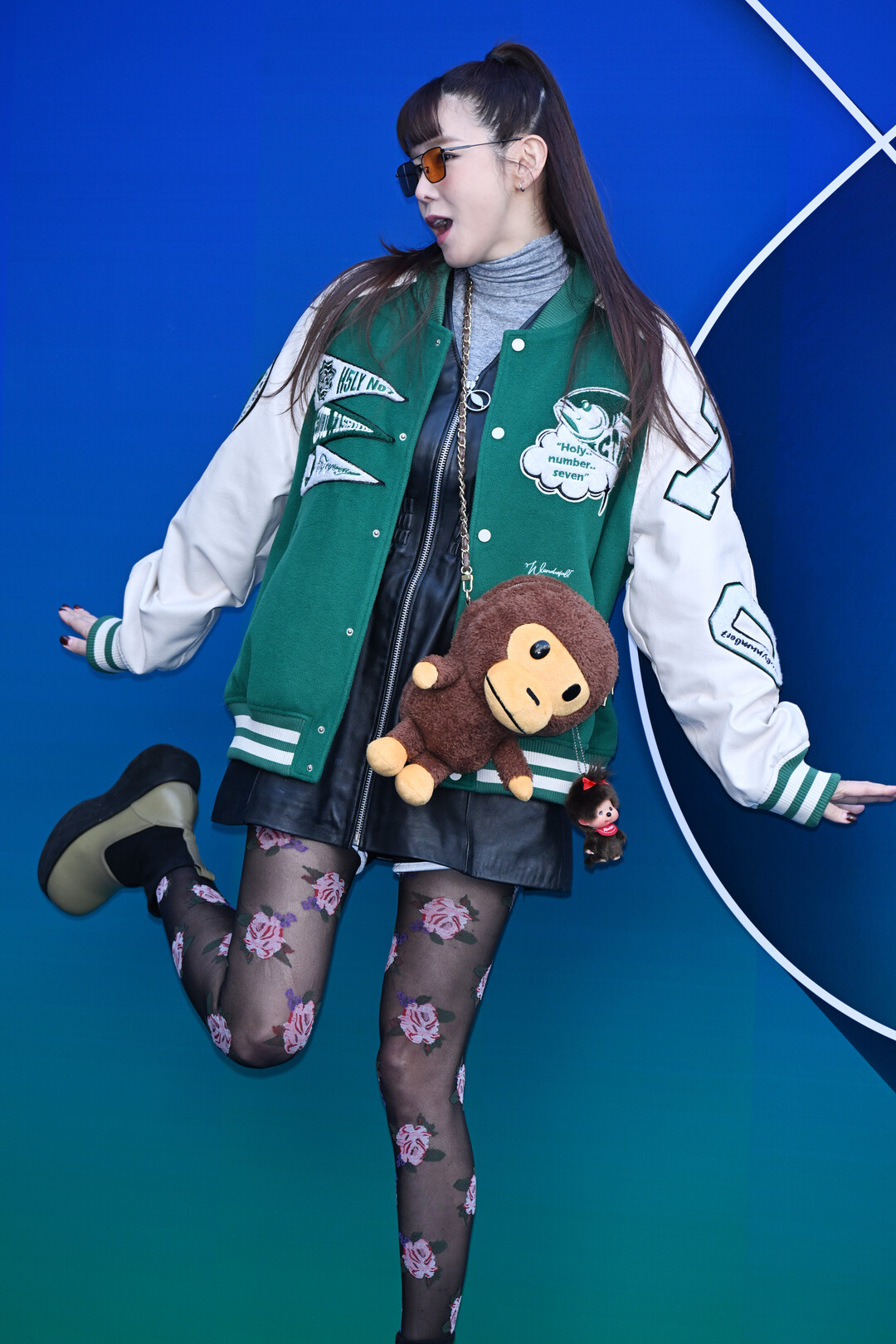 특히 다양한 패치와 엠블럼이 장식된 오버사이즈 바시티 재킷은 미국 칼리지 스타일을 연상시키며, 그린 컬러의 본체와 화이트 소매의 대비가 시선을 사로잡았다. 재킷 안에 레이어드한 블랙 레더 집업 베스트는 스포티한 룩에 엣지 있는 감성을 더했다.