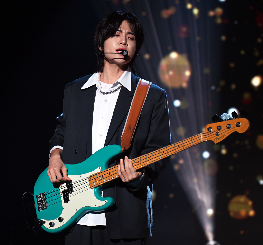 쇼케이스에서 강산이는 청록색 베이스 기타를 연주하며 집중력 있는 무대 매너를 보여줬다. 블랙 수트와 대비되는 비비드한 베이스 컬러는 시각적 임팩트를 극대화하며, 차분한 의상 속에서 악기가 강조점 역할을 했다. 헤드셋 마이크를 착용한 모습에서는 연주와 보컬을 동시에 소화하는 멀티플레이어로서의 면모가 드러났다.