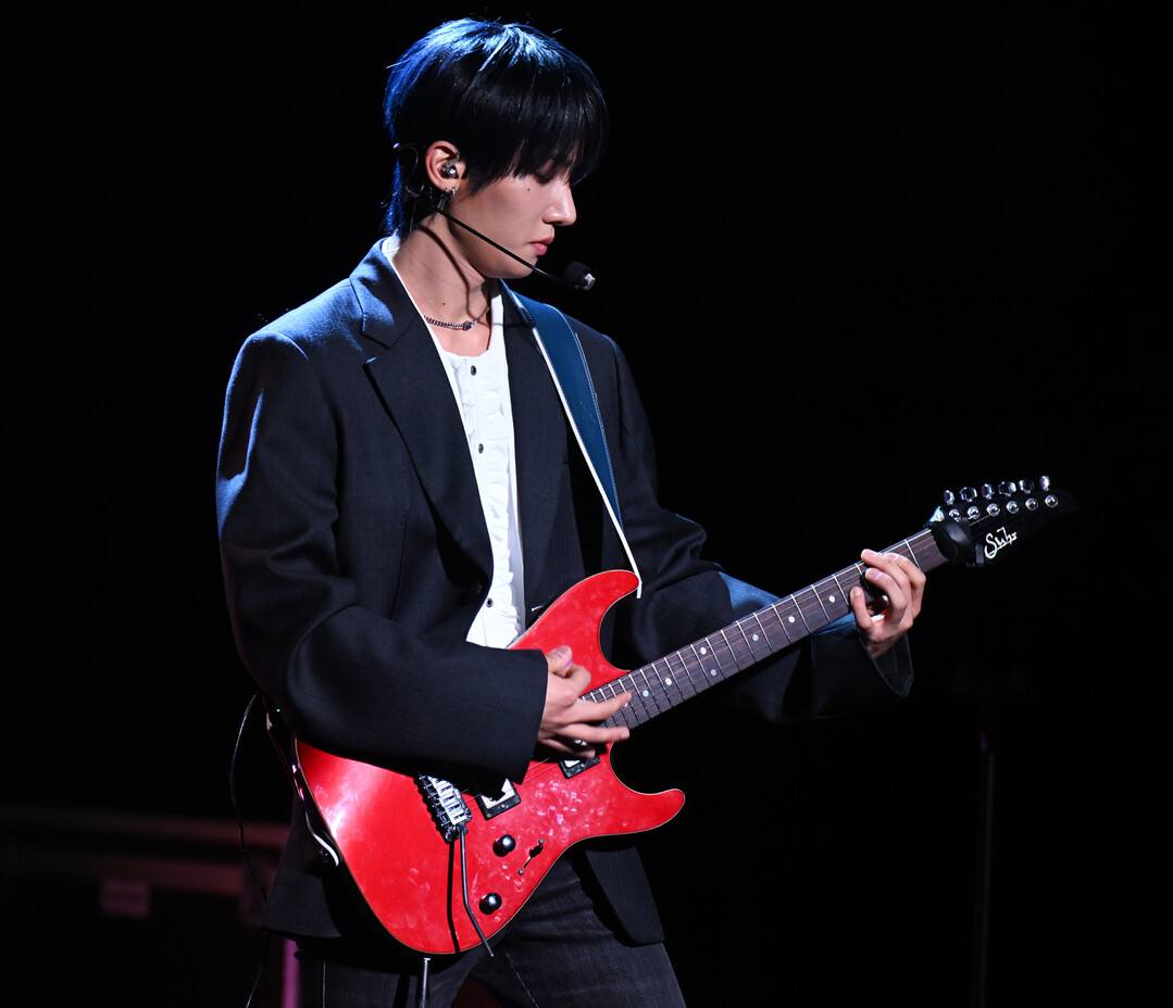안기훈은 선명한 레드 일렉 기타를 연주하며 집중력 있는 무대를 펼쳤다. 블루 조명 아래에서도 강렬하게 돋보이는 레드 기타는 블랙 수트와 극명한 대비를 이루며 시각적 임팩트를 극대화했다. 헤드셋을 착용한 모습에서는 기타 연주와 보컬을 동시에 소화하는 멀티 퍼포머로서의 역량이 드러났다.