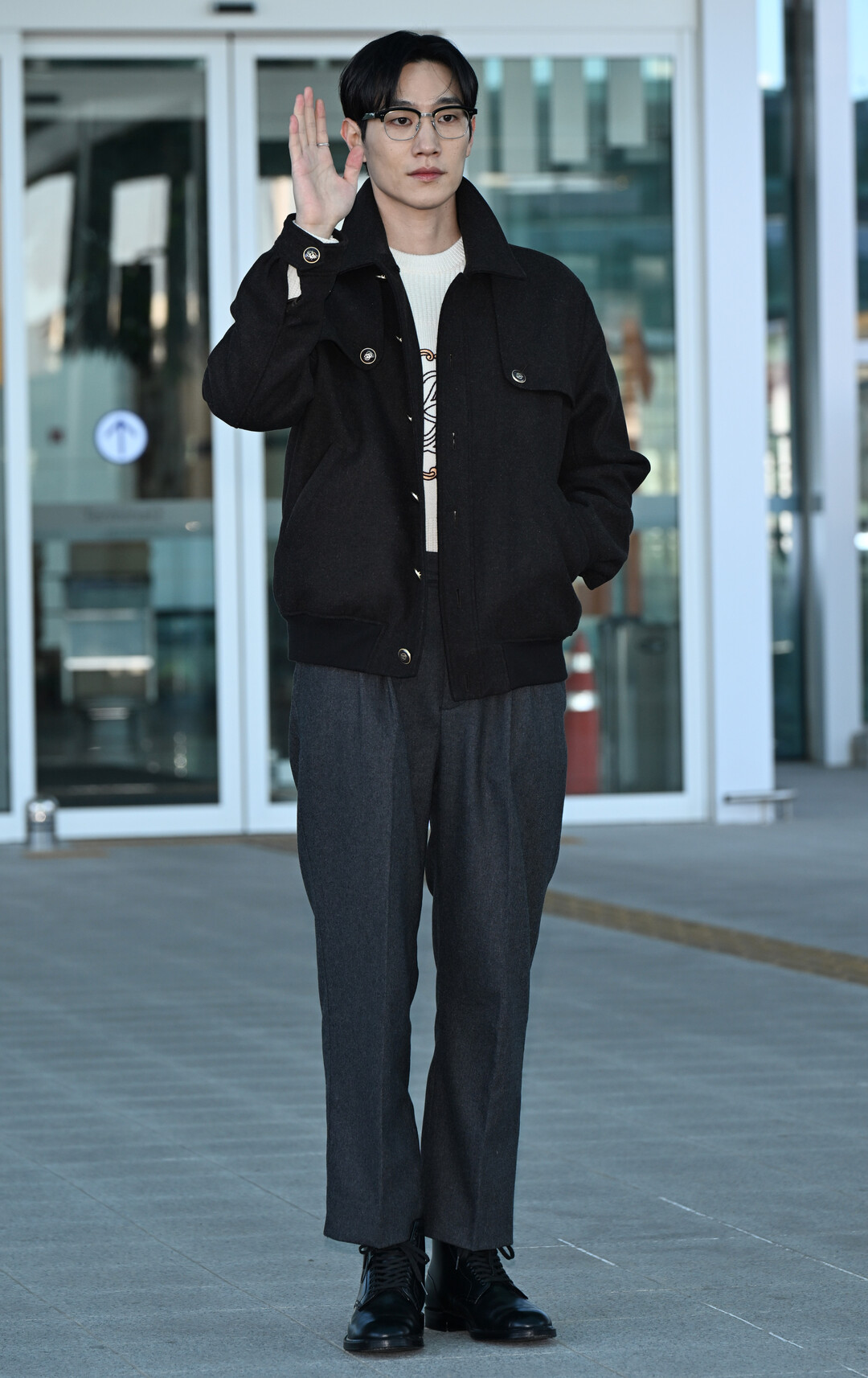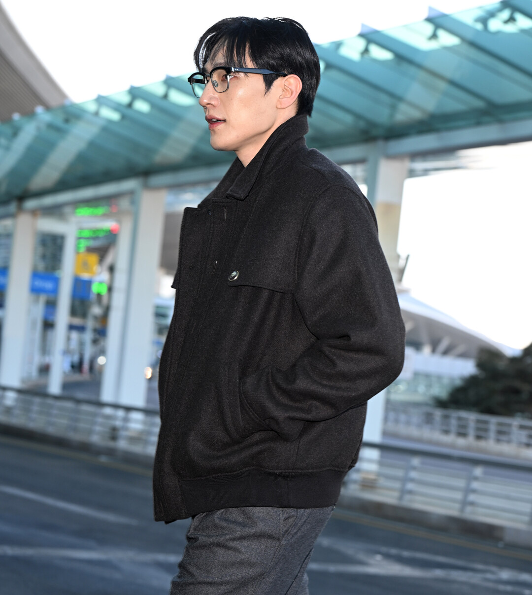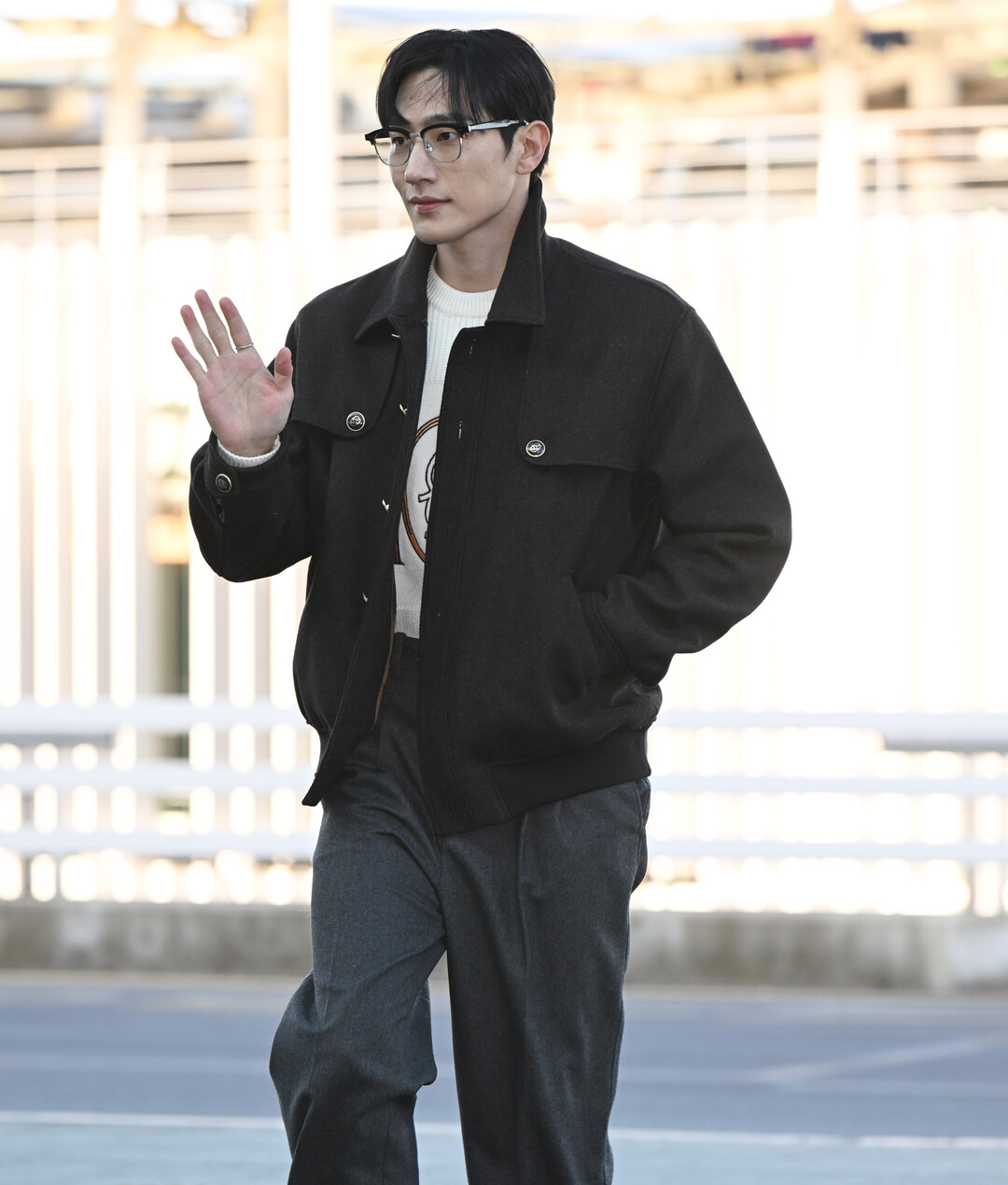 노상현은 이날 블랙 컬러 오버사이즈 블루종을 메인 아이템으로 한 모노톤 공항 패션을 선보였다. 넉넉한 실루엣의 블랙 블루종은 가슴 포켓과 메탈 버튼 디테일이 돋보이며, 캐주얼하면서도 세련된 분위기를 연출했다.